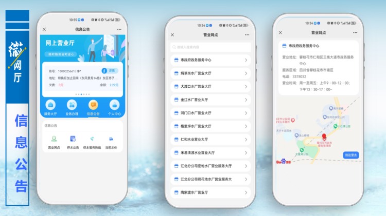 信息公告模塊對(duì)公司營業(yè)網(wǎng)點(diǎn),停水通知,服務(wù)熱線等信息進(jìn)行公開發(fā)布,后期我們將持續(xù)進(jìn)行更新。