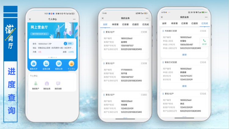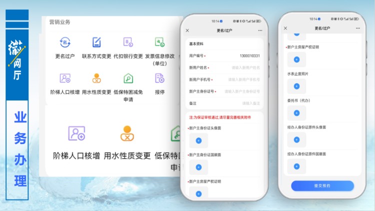 以更名過戶為例,用戶點(diǎn)擊更名過戶功能按鈕,進(jìn)入提交資料界面,按照頁面提示,填寫相關(guān)信息和拍照上傳附件,提交預(yù)約,后臺(tái)管理人員審核通過,便完成更名過戶辦理,用戶無需再到營業(yè)大廳線下辦理任何手續(xù)。