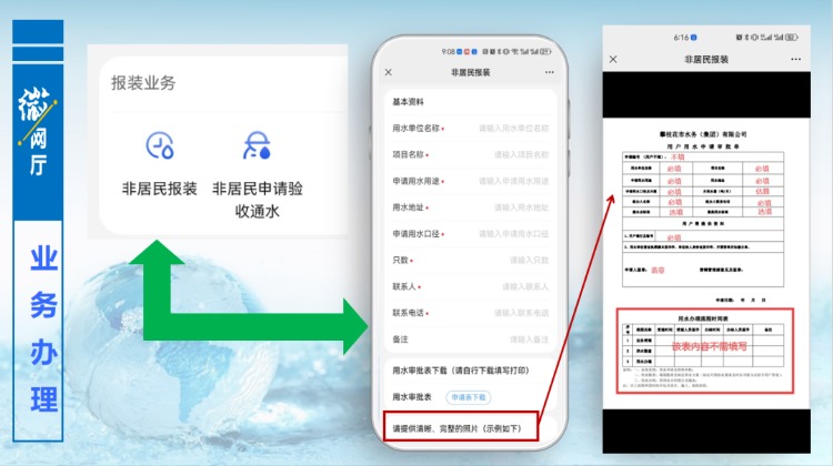 用戶可在報(bào)裝業(yè)務(wù)版塊中申請(qǐng)獲得用水。進(jìn)入報(bào)裝業(yè)務(wù)版塊,下載用水審批表,按照示例圖片,完善表格內(nèi)容,再拍照上傳,填寫好相關(guān)信息及附件,提交預(yù)約后,由后臺(tái)工作人員接單,進(jìn)入辦理流程,流程完結(jié),告知申請(qǐng)人是否滿足接水條件,完成報(bào)裝申請(qǐng)。