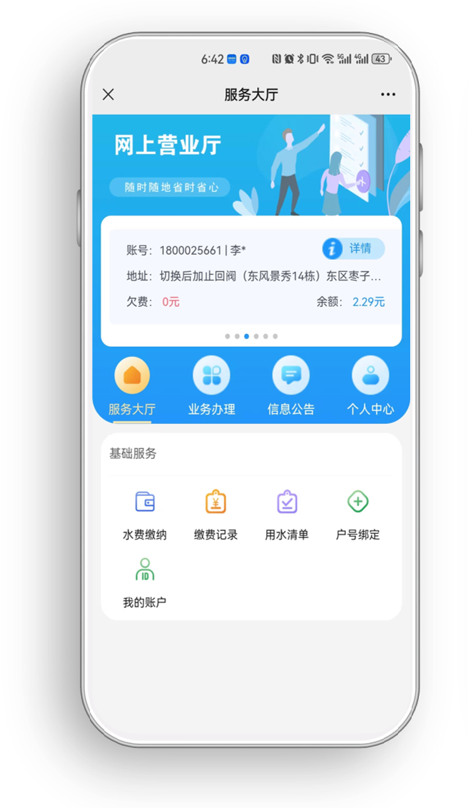 按照提示步驟,綁定用水開戶賬號(hào)后,就能輕松便捷使用“微網(wǎng)廳”各項(xiàng)服務(wù)功能。用水開戶賬號(hào)可查閱供水合同、服務(wù)短信或致電供水服務(wù)片區(qū)營業(yè)服務(wù)熱線進(jìn)行查詢。