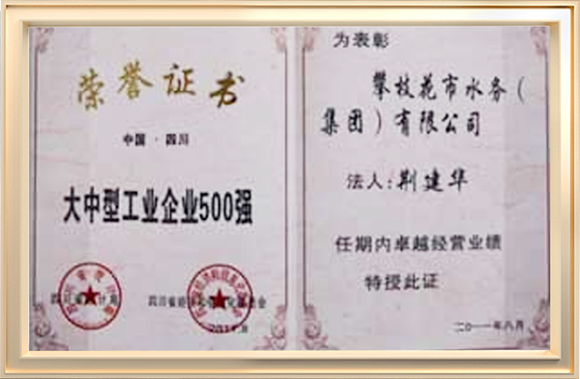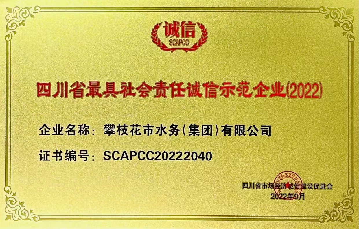 先后榮獲了全國模范勞動關(guān)系和諧企業(yè)、全國“五一"勞動獎狀、全國“安康杯競賽活動優(yōu)勝單位"、中國供水排水行業(yè)突出質(zhì)獻(xiàn)單位獎、全國模范職工之家、國家建設(shè)部精神文明建設(shè)先進(jìn)單位、發(fā)揚(yáng)“水之魂”精神為震后重建再立新功、四川省“五一”勞動獎狀、四川省誠信示范單位、四川省先進(jìn)企業(yè)、四川省大中型工業(yè)企業(yè)500強(qiáng)、四川省水的生產(chǎn)和供應(yīng)最效益十強(qiáng)最大規(guī)模十強(qiáng),攀枝花市企業(yè)50強(qiáng),攀枝花市A級納稅單位等數(shù)十項(xiàng)帶譽(yù)稱號。
